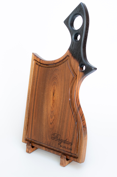 Elegance” este un tocător premium (charcuterie board) din lemn de nuc masiv, lucrat manual, cu juice groove protejat cu rășină epoxidică pentru o curățare mai ușoară și o rezistență sporită la lichide. Designul cu mâner sculptat îl face ideal atât pentru tăiere, cât și pentru servire, iar la cerere poate fi personalizat prin gravură CNC cu text sau imagine.