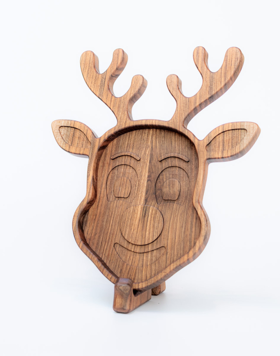 Cu un zâmbet prietenos și un design care amintește de magia iernii, tăvița în formă de cap de ren aduce instant un strop de sărbătoare în orice casă. Lucrată cu grijă din lemn de nuc, este o piesă practică și decorativă, gândită special pentru copii, dar la fel de frumoasă și pentru adulții care iubesc detaliile handmade.
